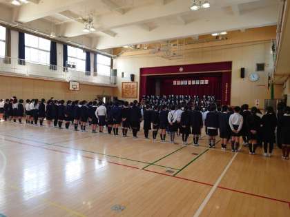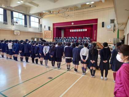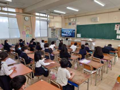 6年生が講堂のひな壇に座り、1〜5年生が自分たちの順番になると講堂に行き、歌や呼びかけを披露しました。自分たちの順番以外の時は、教室からリモートで参加しました。