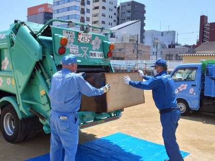 「ごみ」の行方を社会科の学習で探求していく中で、パッカー車のことを学びました。普段よく見るごみ収集車ですが、今日は目の前でごみが処分されていく様子を学習することができました。最後には、大きなタンスがパッカー車に飲み込まれていく様子も…。すごい力を持っていました。「パワー!」