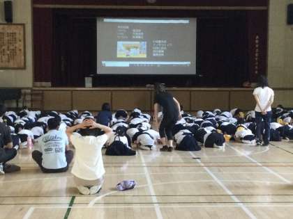 1〜3年生は消防車を見学した後、ビデオを視聴し、地震が起きた時に自分の身を守りながら避難する方法を学びました。