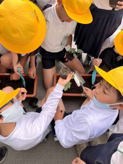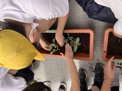 ポットで育てていた植物をプランターに植えかえています。