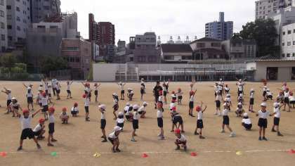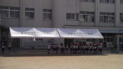 運動場での練習の少しでも役に立てたらと、砂場前にテントを張りました。水筒を置いたり、先生の話を聞いたり、休憩したり・・・、色々な使い方をしています。