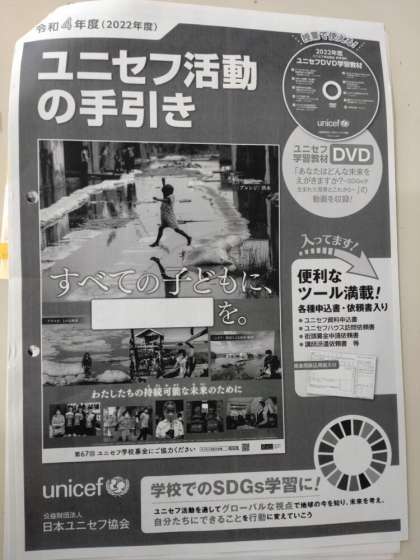 ご存じですか?100円で、4〜5リットルの水を飲めるようにする浄水剤が263錠分購入できることを。100円が集まると、はしかを防ぐ予防接種用ワクチンを10回分用意できることを。そんな活動を続けているユニセフに賛同し、募金をしてくれたお友だちがいます。きっと、お小遣いの中から出してくれたのでしょう。ユニセフ活動を通してグローバルな視点で地球の今を知り、未来を考え、自分たちにできることを行動に変えていく、大切な一歩を勇気を出して踏み出してくれたお友だちです。これからも、わたしたちの持続可能な未来のために、SDGs学習をさらに進めていきたいと思います。