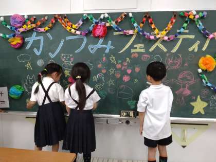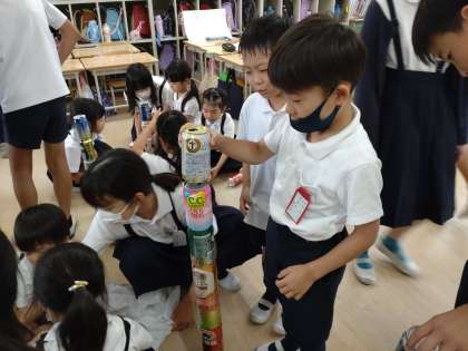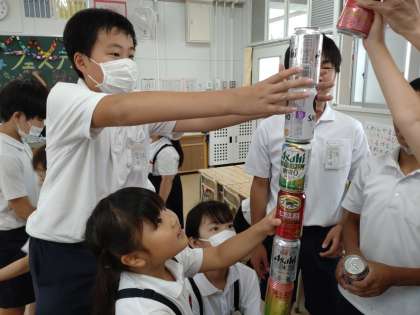 今日は、1年生と6年生のペア学級フェスティバルの日です。楽しいお店を準備して、学年をこえて交流を図り、ペア学年で共に遊ぼうという集会です。今日は6年生が空き缶を用意しました。さぁ、どっちが上手に高くつめるかな?「うわ、すごい。イスを持ってきて!早く、早く!」「あぁ〜、たおれた!ザンネン!」などなど。楽しそうな声が教室にあふれています。こうして交流を深めていくことで、6年生は高学年の自覚を育て、1年生は人とつながることの大切さを学んでいくのですね。大きい6年生と、かわいらしい1年生が楽しそうに遊んでいる様子は、いそがしい日々の中の、ホッとした心のオアシスとなりました。