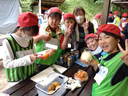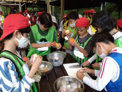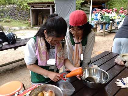 今夜の晩ごはんをかけて、カレーづくりが始まりました。「おいしいカレーを!」を合い言葉に、グループで協力して作業は進みます。包丁の使い方がちょっと不安ですが…。大丈夫かな?