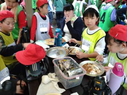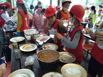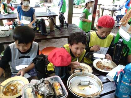 できました!火おこしは大変でした。まだちょっとニンジンはカタかったけど、味は最高でした。やっぱりみんなで作ったカレーはおいしいです。「いただきます!」