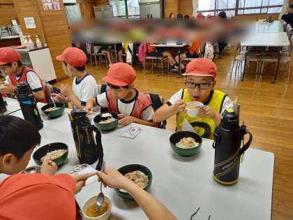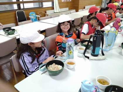 神戸市立自然の家での最後の食事になりました。朝の活動でお腹はペコペコです。楽しかった思い出をかみしめるように、しっかりガッツリゆっくり食べています。