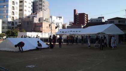 そこで、ご近所の阿倍野高校からテントをお借りすることになりました。その時に、阿倍野高校の運動部の生徒さんが応援に駆け付けてくれました。その後、苗代小学校でテントがそろったのですが、阿倍野高校のみなさんが応援に駆け付けてくれています。アッと言う間にテントが張り上がり、一気に運動会ムードになりました。