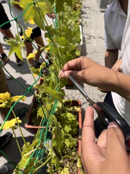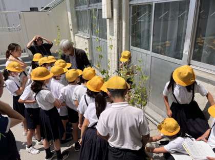 4年生では、プラスチックのスポンジたわしの代わりにへちまたわしを使おうとヘチマを育てています。