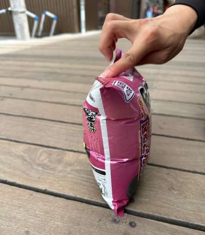 富士山に登った先生がおかしを買って山頂まで持っていくと、おかしのふくろがぱんぱんになっていたそうです。(写真1枚目がもともとの様子、2枚目が山頂での様子)