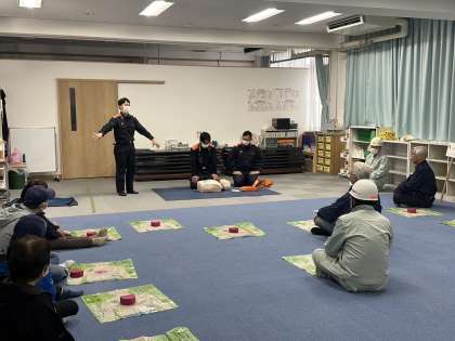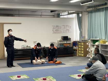 阿倍野消防署の方々より、緊急時のAEDの使い方や心肺蘇生の方法などを教えていただき、訓練を行っていました。