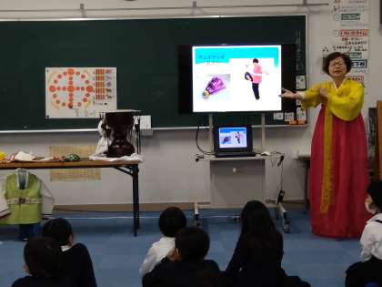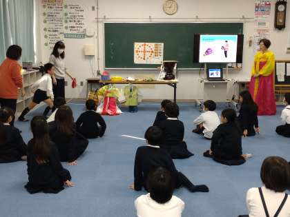 3年生の子どもたちが、国際理解教育の一環としてお隣の国、韓国・朝鮮の社会や文化について学習しました。ソンセンニムに来ていただき、実物に触れることのできる「出前授業」です。チマチョゴリやパジチョゴリを見ながら、日本の服装とのちがいに気づいたり、いろいろな遊びを紹介していただき、日本と似ているとこがあることに気づいたり…。グループに分かれて、ユンノリ(「윷(ユッ)」は、ユンノリを行う際に使用する「棒」、「놀이(ノリ)」は「遊び」という意味です。)という双六に似たゲームを通して、みんなで楽しい時間を過ごすこともできました。今後、ますます国際化が進んでいく社会を生きていく子どもたちです。「ちがい」を違いとして認め合い、お互い理解し合い、協力し合っていく力を、子どもたちには身に着けてほしいと願っています。そんな出前授業って、いいんじゃな〜い。