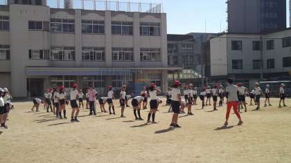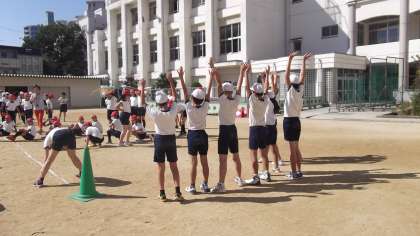 秋空の下、5年1組と6年2組が合同で体育をしました。