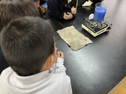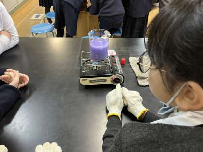 ビーカーに入った水のあたたまり方を調べる実験を行いました。実験では、ビーカーの底を熱し、インクの色の変化を観察しました。すると、あたためられた部分の水が動き、ビーカー全体があたたまっていくことが明らかになりました。