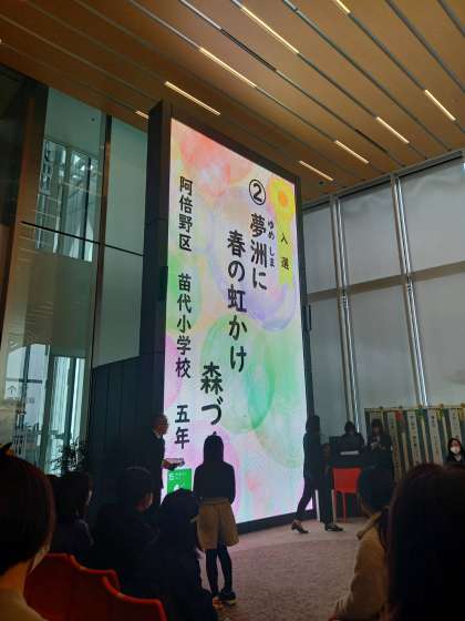 今年度の2学期に、5年生が「2025年大阪・関西万博へようこそ!こども句会5・7・5」(大阪市教育委員会第4教育ブロック主催)に参加し、俳句を一人一句作成して応募しました。3000を超える応募があり、厳正な選定の結果20句が入選し、そのうち、苗代小学校からも一人入選しました。先日、入選した子どもたちがあべのハルカスで行われたこども句会に招待され、苗代小学校からも参加してきましたよ。参加した子どもたちがみんなで投票して最優秀賞などを決めたり、それぞれの句に込めた思いを発表し合ったりして、緊張しながらも楽しく学び合っていて、とても良い経験になりました。