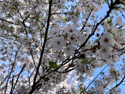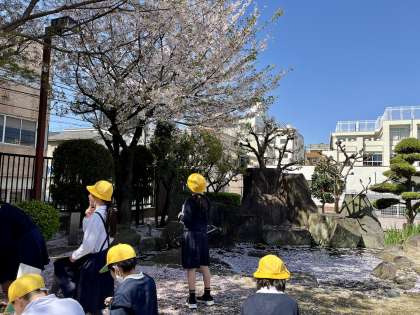 ピンク色のじゅうたんが一面に広がっています。今日は、理科の授業で、この美しい桜の花をみんなで観察しました。