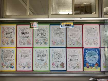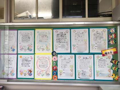 職員室前の掲示板に各委員会の活動内容の紹介や、各代表委員の意気込みを書いたポスターを掲示しています。