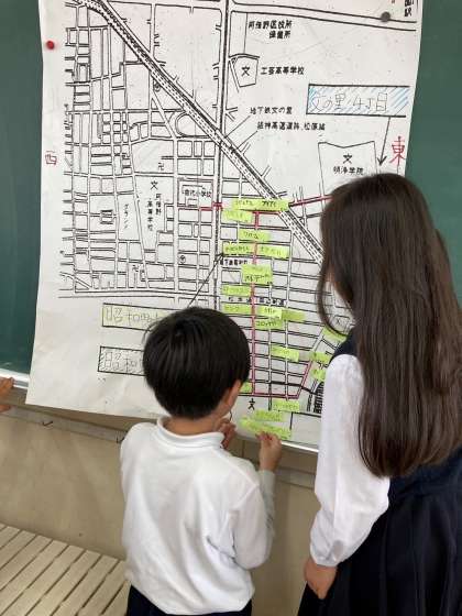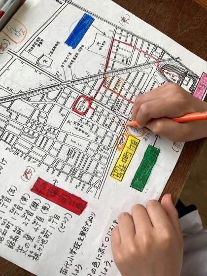 学校に戻ってきてから地図にまとめる活動を行いました。