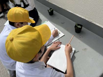 その葉には、まるでハートのような愛らしい模様がついているのを見つけました。まるで、ヘチマの種子が「元気に育ってね!」というメッセージを送ってくれているようです。双葉の表と裏では様子が違うことに気づいた児童もいました。まだ小さな双葉ですが、これからぐんぐんと成長していくのが楽しみです。