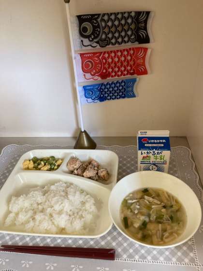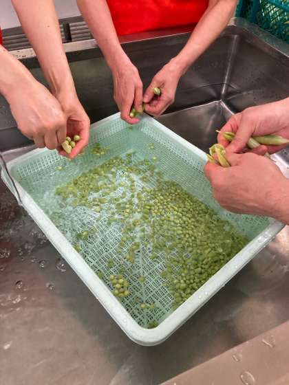 今日の給食では、給食室でさやから取り出したえんどうを使って卵でとじた「えんどうの卵とじ」が登場しました。卵アレルギーの児童も食べられるように、えんどうを卵でとじる前に取り出した除去食も登場しました。