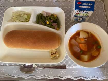 今日の給食では、生のさんどまめをベーコンとコーンとでソテーにしています。