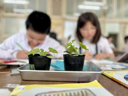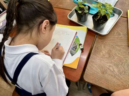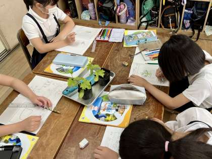 先日、子葉が生えたヘチマを4年生のみんなで観察しました。そして今回、本葉が生えたヘチマを観察すると、色や形、手触りが子葉と全然違うことに気がつきました!