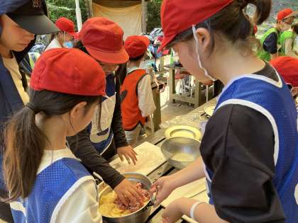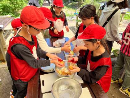 朝からそわそわワクワク、5年生は力を合わせて 絶品カレーを目指します。玉ねぎの皮をむく手は慣れたもので、あっという間に山盛りの玉ねぎが。包丁を手に取ると、ジャガイモもあっという間にコロコロに。みんなで協力して、野菜を鍋へと運んでいきます。