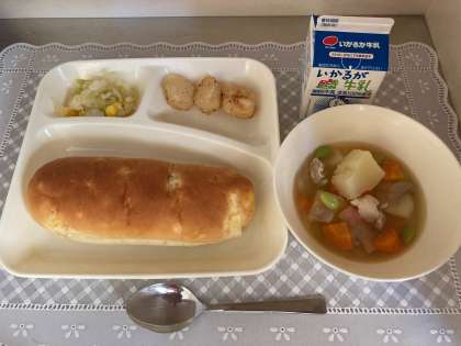今日の給食では、「フレッシュトマトのスープ煮」に生のトマトを使っています。