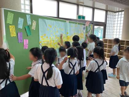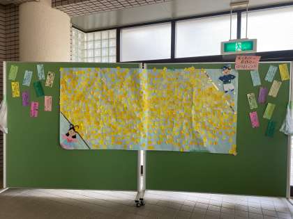 「みんなで織姫と彦星をで合わせよう。」を目標に、あいさつをすると1日1枚もらえる星のシールを、天の川に貼っていきました。