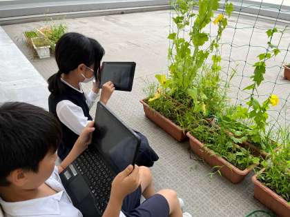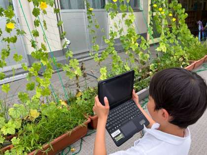 葉っぱはどんどん大きくなり、つるはぐんぐん伸びて、今では校舎の2階近くまで届きそうです。まるで緑のカーテンのようですね。