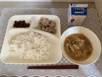 今日の給食には、柔らかく煮込まれた金時豆の煮ものが登場しました。