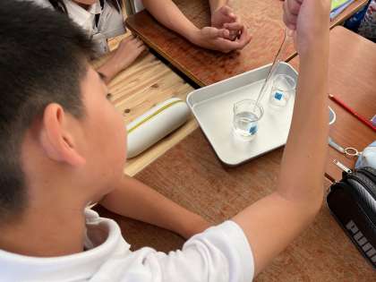今回の実験では、こまごめピペットの使い方を練習しました。ゴム球をゆっくりと押し出して液体を吸い上げたり、目盛りに合わせて液量を調整したりと、子どもたちは真剣な表情で取り組んでいました。