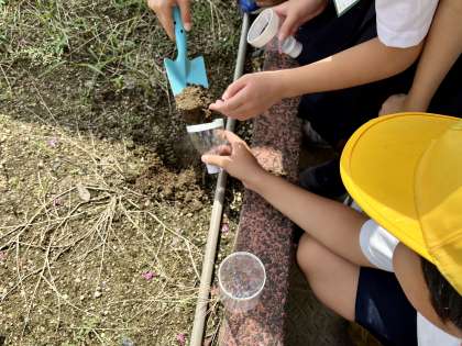 前回の4年生の理科の学習では、実験用の土を使って、土の粒の大きさによって水がどのくらい早くしみ込むのかを調べました。でも、今回は、もっと身近なところにある土に注目してみようと思い、運動場、砂場、花だんなどの場所を選びました。それぞれの場所で土を少しだけ取ってきて、実験をすることにしたのです。