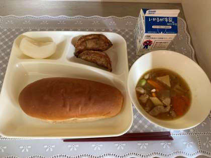 今日の給食は、児童に大人気の「あげギョーザ」でした。おかわりする児童がたくさんいました。なし(豊水)は、みずみずしくて甘く、みんなどれもおいしそうに食べていました。