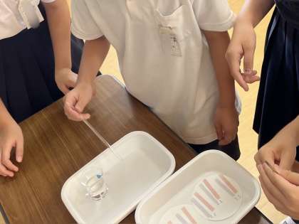 実験では、前回区別できなかった水よう液に、順番にリトマス紙をつけてみました。すると、ある水よう液ではリトマス紙が赤く変色し、別の水よう液では青く変色するものもありました。実験結果を見て、みんなは「どうして色が変わるんだろう?」「この水よう液は何性かな?」と、たくさんの疑問がわいてきたようです。