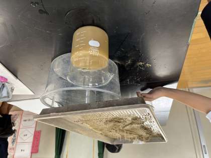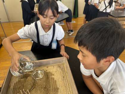 そこで、教室で小さな川を作って実験してみることにしました。実験では、土を盛り上げ、そこに水を流して、流れる水がどのように地面を変えていくのかを観察しました。すると、流れる水と一緒に土のつぶが移動して、地面が少しずつ変化していく様子を見ることができました。
