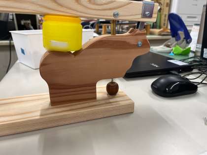職員室をのぞいてみると、そこには想像もしていなかった光景が広がっていました。なんと、先生がリスになったかのように、木の実に一生けんめいあなを開けているではありませんか!
