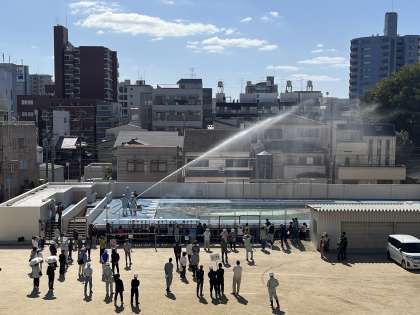 たくさんの方々に見守られての可搬式ポンプ放水訓練では、防災担当の方々を中心にプールの水を使って行われました。
