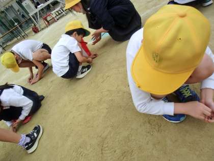 2・5年、3・4年、1.6年のペア学年に分かれて、運動場の石拾いをしました。