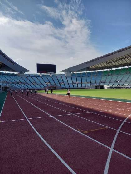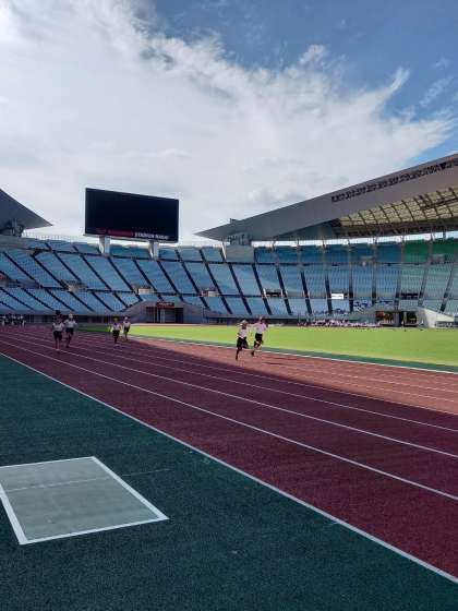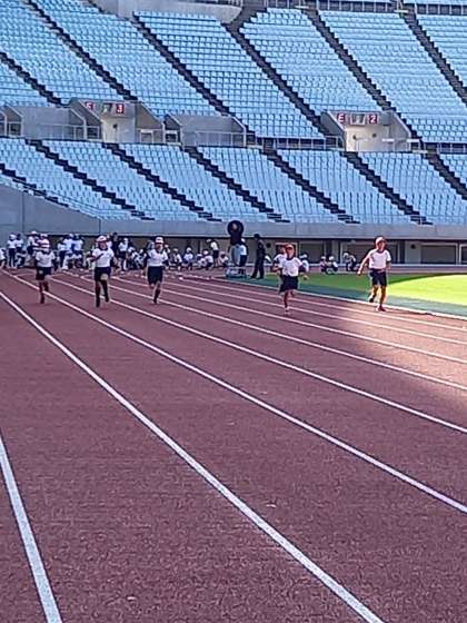 「がんばれ〜」との子どもたちの声援がスタジアムに響いていました。