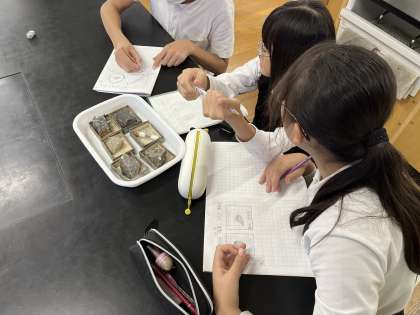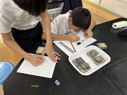 そこで今回の授業では、様々な場所で見つかった動物や植物の化石を観察しました。子どもたちは、本物の化石を前に、「昔、本当に生き物がいたんだ!」「こんな形をしていたんだ!」と驚きと感動の声を上げていました。化石の種類や特徴を観察することで、過去の地球の環境や、そこに生息していた生き物たちの姿を想像することができたと思います。