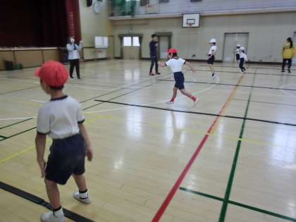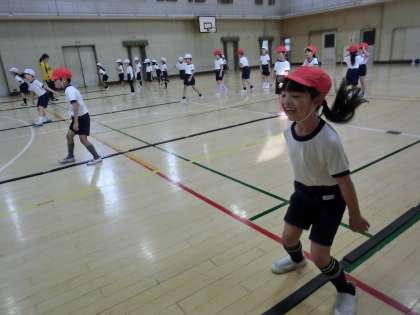 なんでも元気に一生懸命取り組む1年生。体育館は笑顔でいっぱいになりました。