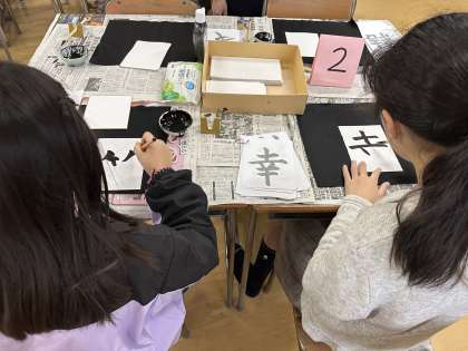 「書道」(活動室)では、生涯学習の方が教わりながら、子どもたちは色紙に上手に字を書いていました。