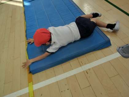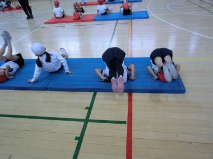えんぴつのようにまっすぐ伸びて、マットから落ちないようにクルクル転がったり、おむすびのようにコロコロ転がったりしていました。中には回りすぎて目を回してしまう児童も…。