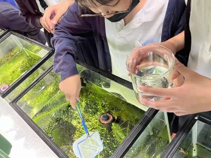 今年の春、理科室でひっそりと暮らしていた6匹のメダカたちは、児童の愛情深いお世話のもと、今では約100匹の大家族に成長しました。小さな水そうでは、活発に泳ぎ回るメダカたちにとってせまくなってきたため、より広い場所で暮らさせてあげたいという子どもたちの願いがつのっていました。