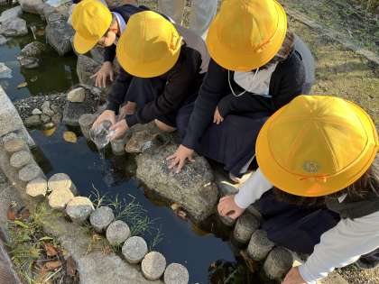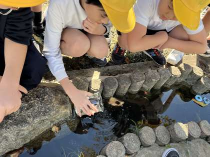 そこで、学校にある学習園の一角に、メダカたちが快適に過ごせる新しいお家を作る計画が始まりました。まずは、メダカが外へ逃げてしまわないよう、しっかりと囲いを作り、4匹のメダカを試しに放流して様子をみました。そして、メダカたちが新しい環境に順応できるか、数日後、メダカたちは元気に泳ぎ回り、新しい命も誕生していることを確認しました。