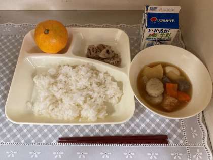 今日の給食では、鶏肉、うずら卵、ごぼう平天、じゃがいも、こんにゃく、あつあげ、だいこん、にんじんが使われています。