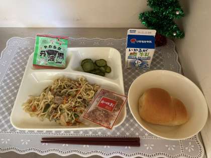 和風焼きそばは、ソースではなくしょうゆで味付けします。あっさりと仕上がりますが、ソース味と同様、児童に人気の献立です。かつおぶしをふりかけて、いただきました。