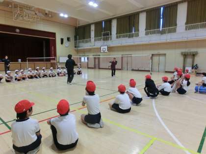 バルセロナオリンピックにも出場された岩城ハルミさんに来ていただき、5年生の子どもたちにバドミントンの指導をしていただきました。利き手と利き足を一緒に動かし、反対の手はバランスをとるために大きく広げると良いそうです。