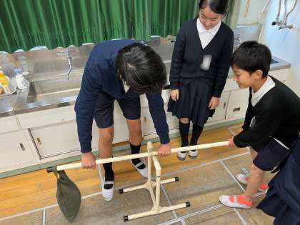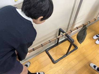 実験では、おもりをつるす位置と、手で棒をおす位置を様々に変えながら、必要な力の大きさを比かくしました。おもりをつるす位置を支点(棒を支える点)に近づけたり遠ざけたりすると、持ち上げるために必要な力が変化することに気付いていました。