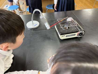 4年生は、2学期に身の回りのものをあたためたり冷やしたりすると、体積がどう変わるのかを学習しましたね。今回は、さらに一歩進んで、温めるときにものがどのようにあたたまっていくのか、そのあたたまり方について詳しく調べていきました。